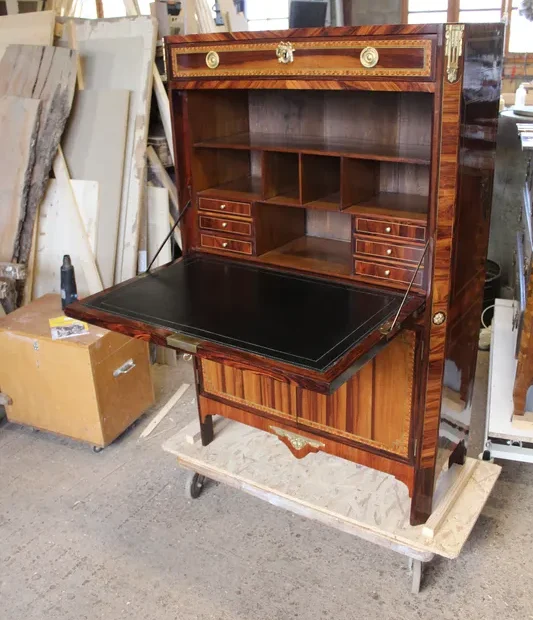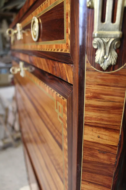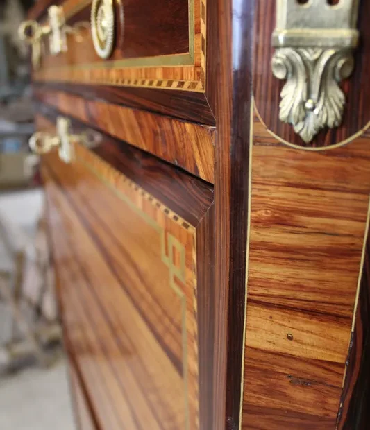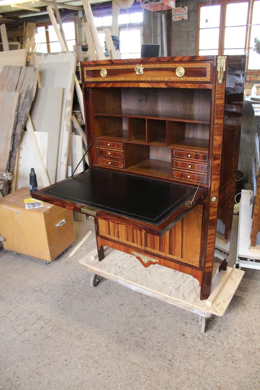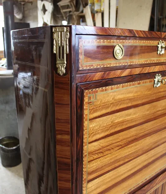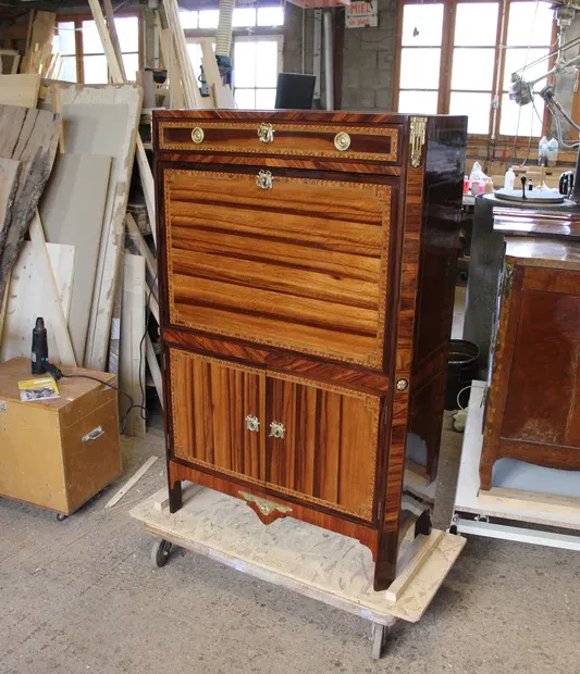 Le contrôle : Ils vérifiaient la qualité du bois (souvent du chêne pour le bâti), la solidité de l'assemblage et la finesse du placage.